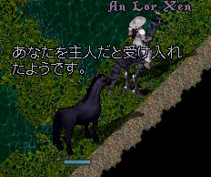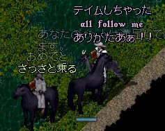 くおさんとICQで話しながらデーモンを狩る。 例のユニコーンは、スキルさえあればかなり楽にテイムできるみたい。 某テイマーさんのHPを見ると、 ユニコーンはカルマがプラスな キャラクターには襲いかからないとか。 誇り高い動物ですな( ̄▽ ̄) と、麒麟をテイムしに行っていたくおさん、 現地でメアを死なせたもよう。あうち。 麒麟の湧くダンジョンの奥、聞いた話によると、 毒エレやメアまで湧くので、単独で行くのは危ないみたい(>▲<) メア残念でしたのう。 でも、くおさんは自分でテイムできるからいいですな〜 また蜘蛛城の地下に行くときは あたいも呼んで下され(=▽=)ノ 『今から行きますよ。来ます?』 「はいはい行きますよー行きますよー!」 行き先の蜘蛛城地下は、今回もフェルッカ。 PKがいるかもしれないから、メアなんか乗っていけないのだ。 メアは自宅の屋上に待たせておいて、 森林オスタに乗って行きませう。 1,2時間じゃメアも野生化しないハズ。 浮気したら殺す! ムーンゲートでフェルッカへGO! くおさんのゲートで蜘蛛城の地下へ!(=■=)ノ ![]() いたよいたよ!野生のメア!(>▽<)ノ 前回のくおさんのテイムスタイルは、すでに盗んだ! (パラでメアを麻痺)→(テイム開始)→(インビジで隠れる) これに、あたいがアレンジを加えてマクロ登録したのだ。 ずばり! 同じマクロに ユーズスキル(アニマルテイミング) キャストスペル(インビジビリティ) の2つを登録。 ボタン一発で、時間差でカーソルが2度出るなり。 1度目のカーソルをメアに、(テイム開始) 2度目のカーソルを自分に。(自分隠れる) インビジの詠唱時間があるから、時間的にも余裕あり。 すでに白熊で実験していたから、 あせることなくメアと向かい合えるばい( ̄▽ ̄) ![]() 一緒に旅に出ようよ。(>■<)ノ ぬぅ〜・・・まだ無理なのかな。 現在のテイムスキルは95.5。 ドラゴンですら20分かかる時もあるし。 くおさん、初めてメアテイム成功した時って、 スキルいくつくらいでした? 『97くらいかな。』 「Σ( ̄▲ ̄;)」 やっぱり無理っぽいですなw 今回もくおさんにテイムしてもらっ・・・ 『頑張って〜』 うっ、うれしいなり。 よっしゃ!頑張るぜい!(=■=)ノ